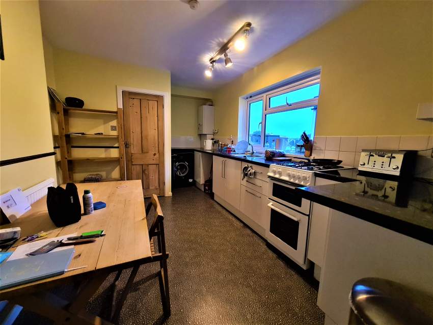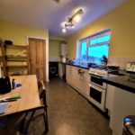 Kitchen has ample amount of storage. Furnished with table and chairs. Fitted with gas hob, double oven and fridge-freezer. Washing machine available*