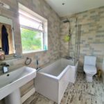 Modern fully tiled bathroom with rain fall shower head over bath.